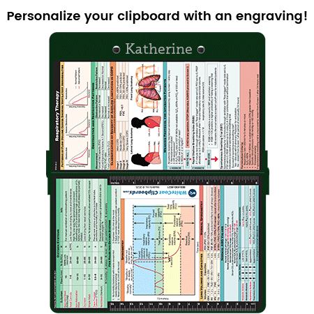 Full size medical pocket clipboard from WhiteCoat Clipboards. Unique design allows you to fold the clipboard in half for storage in your pocket. Made of lightweight aluminum with the ability to carry 30 pieces of paper without a crease while at the same time securing all your medical information inside. Carry patient respiratory assessment forms, ventilator logs, medication lists, and all your documentation in a HIPAA secure clipboard. The clipboard also functions as a quick medical reference guide with detailed day-to-day information such as spirometry assessment with COPD criteria, acid base determination and expected compensation, ventilator weaning and Rapid Swallow Breathing Index (RSBI), oxygen systems and flow rates.