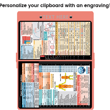 WhiteCoat® Clipboard Flight Medic Edition is an essential resource for flight crews responding to emergencies. Use this quick medical reference to diagnose patient abnormalities in vitals, oxygenation, burns, and more. You can now write down essential patient information with this one-of-a-kind patented full size folding clipboard with other medical information on burns (rule of nines, body surface area), cardiac pressor use, vent management, using neuromuscular blocking agents, glasgow coma scale, drip calculations and shock index.