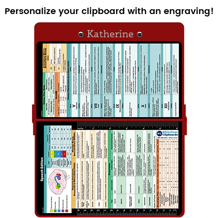 WhiteCoat Clipboards® are tools for healthcare professionals to use, carry, and store information while taking care of patients. They contain quick medical references used daily by clinicians, nurses, CNAs, and other allied medical fields. Our speech language pathology edition clipboard includes useful information on dysarthria types, swallow evaluations, cranial nerves involved in swallowing, and the areas affected in the brain. This full-size folding clipboard is made of lightweight aluminum and can carry 30 pieces of paper without a crease, securing all your medical information. Store patient assessment forms, protocols, medication lists, and all your documentation in a HIPAA compliant clipboard. Hover over the images to see the speech language pathology specific information on this WhiteCoat Clipboard®.