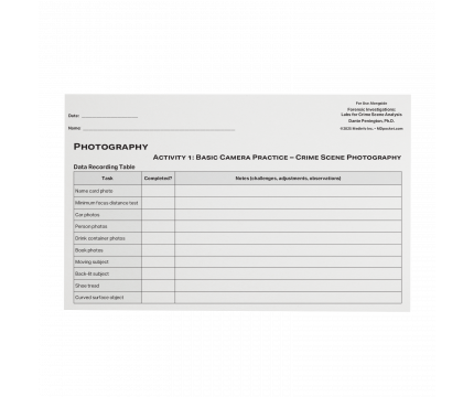 This bundle contains essential materials needed for your introductory crime scene course. It includes a lab book containing 19 sequenced activities from notetaking to bullet-trajectory reconstruction, along with a corresponding notepad for data collection and analysis. Also included is a folding WhiteCoat Clipboard made from lightweight aluminum, showcasing our Crime Scene Investigation label and providing a quick reference to basic crime scene characteristics. This clipboard was designed to hold the corresponding notepad, providing students with a sturdy writing surface for completing labs, which they can tear off and turn in for a grade.