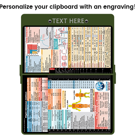 WhiteCoat® Clipboard Flight Medic Edition is an essential resource for flight crews responding to emergencies. Use this quick medical reference to diagnose patient abnormalities in vitals, oxygenation, burns, and more. You can now write down essential patient information with this one-of-a-kind patented full size folding clipboard with other medical information on burns (rule of nines, body surface area), cardiac pressor use, vent management, using neuromuscular blocking agents, glasgow coma scale, drip calculations and shock index.