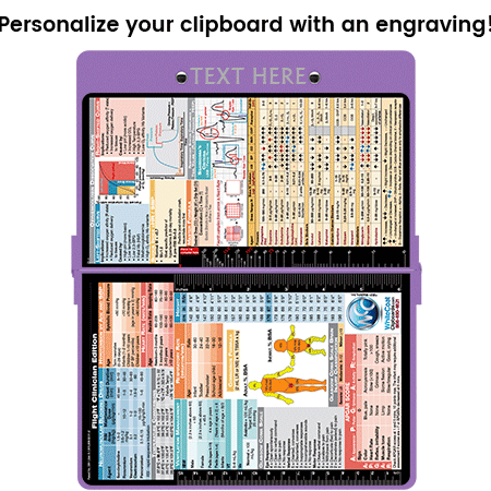 WhiteCoat® Clipboard Flight Medic Edition is an essential resource for flight crews responding to emergencies. Use this quick medical reference to diagnose patient abnormalities in vitals, oxygenation, burns, and more. You can now write down essential patient information with this one-of-a-kind patented full size folding clipboard with other medical information on burns (rule of nines, body surface area), cardiac pressor use, vent management, using neuromuscular blocking agents, glasgow coma scale, drip calculations and shock index.