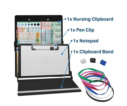 Get a one-of-a-kind patented full size folding clipboard with all our clipboard accessories at a great discount. This Clipboard Kit contains a WhiteCoat Clipboard made of lightweight aluminum with our nursing label, notepad, WhiteCoat Clipboard Band, and choice between a WhiteCoat Pen Clip or WhiteCoat Inner Pen Clip all at one price. Get the entire package now without the worry of missing items that you should have purchased!