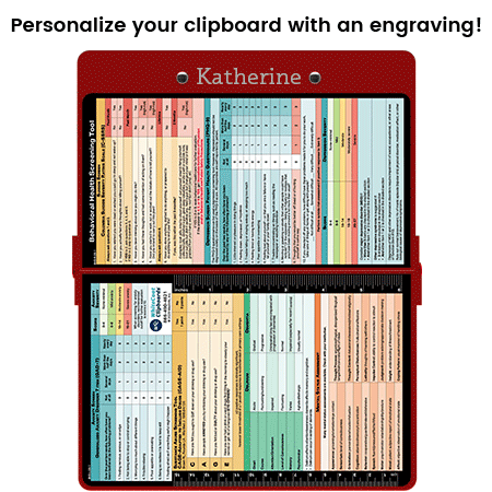 This WhiteCoat Clipboard® features 4 key screening tools for suicide, depression, anxiety and substance abuse so you can have these screens right at your fingertips. This clipboard also includes a Mental Status Assessment and an easy to use table to help you distinguish delirium from dementia. Great for all healthcare providers in Behavioral Health/Mental Health fields.