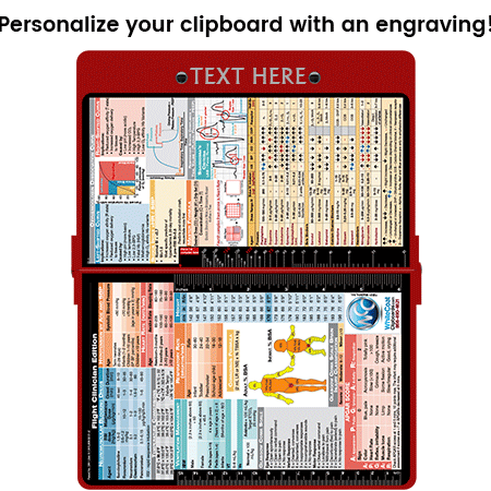 WhiteCoat® Clipboard Flight Medic Edition is an essential resource for flight crews responding to emergencies. Use this quick medical reference to diagnose patient abnormalities in vitals, oxygenation, burns, and more. You can now write down essential patient information with this one-of-a-kind patented full size folding clipboard with other medical information on burns (rule of nines, body surface area), cardiac pressor use, vent management, using neuromuscular blocking agents, glasgow coma scale, drip calculations and shock index.