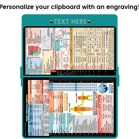 WhiteCoat® Clipboard Flight Medic Edition is an essential resource for flight crews responding to emergencies. Use this quick medical reference to diagnose patient abnormalities in vitals, oxygenation, burns, and more. You can now write down essential patient information with this one-of-a-kind patented full size folding clipboard with other medical information on burns (rule of nines, body surface area), cardiac pressor use, vent management, using neuromuscular blocking agents, glasgow coma scale, drip calculations and shock index.
