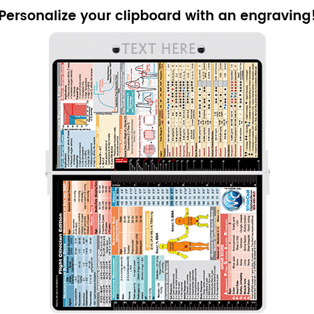 WhiteCoat® Clipboard Flight Medic Edition is an essential resource for flight crews responding to emergencies. Use this quick medical reference to diagnose patient abnormalities in vitals, oxygenation, burns, and more. You can now write down essential patient information with this one-of-a-kind patented full size folding clipboard with other medical information on burns (rule of nines, body surface area), cardiac pressor use, vent management, using neuromuscular blocking agents, glasgow coma scale, drip calculations and shock index.