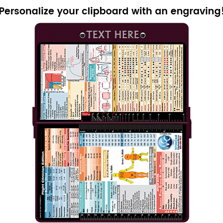 WhiteCoat® Clipboard Flight Medic Edition is an essential resource for flight crews responding to emergencies. Use this quick medical reference to diagnose patient abnormalities in vitals, oxygenation, burns, and more. You can now write down essential patient information with this one-of-a-kind patented full size folding clipboard with other medical information on burns (rule of nines, body surface area), cardiac pressor use, vent management, using neuromuscular blocking agents, glasgow coma scale, drip calculations and shock index.