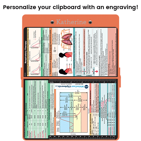 Full size medical pocket clipboard from WhiteCoat Clipboards. Unique design allows you to fold the clipboard in half for storage in your pocket. Made of lightweight aluminum with the ability to carry 30 pieces of paper without a crease while at the same time securing all your medical information inside. Carry patient respiratory assessment forms, ventilator logs, medication lists, and all your documentation in a HIPAA secure clipboard. The clipboard also functions as a quick medical reference guide with detailed day-to-day information such as spirometry assessment with COPD criteria, acid base determination and expected compensation, ventilator weaning and Rapid Swallow Breathing Index (RSBI), oxygen systems and flow rates.