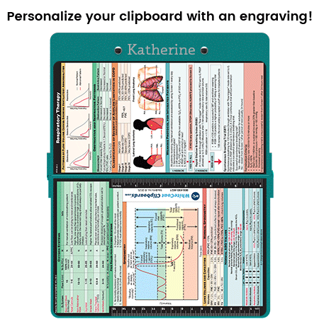Full size medical pocket clipboard from WhiteCoat Clipboards. Unique design allows you to fold the clipboard in half for storage in your pocket. Made of lightweight aluminum with the ability to carry 30 pieces of paper without a crease while at the same time securing all your medical information inside. Carry patient respiratory assessment forms, ventilator logs, medication lists, and all your documentation in a HIPAA secure clipboard. The clipboard also functions as a quick medical reference guide with detailed day-to-day information such as spirometry assessment with COPD criteria, acid base determination and expected compensation, ventilator weaning and Rapid Swallow Breathing Index (RSBI), oxygen systems and flow rates.