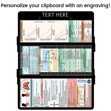 Full-size medical pocket clipboard from WhiteCoat Clipboards® with a unique trifold design for storage in even the smallest of pockets, white coats, and scrubs. Made of lightweight aluminum with the ability to carry 30 pieces of paper without a crease while at the same time securing all your medical information inside. Carry patient respiratory assessment forms, ventilator logs, medication lists, and all your documentation in a HIPAA secure clipboard. The clipboard also functions as a quick medical reference guide with detailed day-to-day information such as spirometry assessment with COPD criteria, acid base determination with expected compensation, ventilator weaning, Rapid Swallow Breathing Index (RSBI), oxygen systems, and flow rates. To see all the medical information on this clipboard, hover over the images above to display high resolution details.
