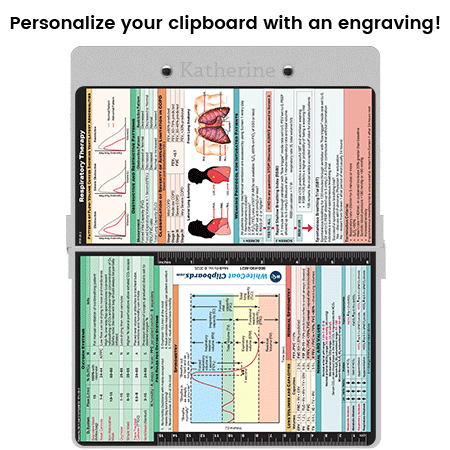 Full size medical pocket clipboard from WhiteCoat Clipboards. Unique design allows you to fold the clipboard in half for storage in your pocket. Made of lightweight aluminum with the ability to carry 30 pieces of paper without a crease while at the same time securing all your medical information inside. Carry patient respiratory assessment forms, ventilator logs, medication lists, and all your documentation in a HIPAA secure clipboard. The clipboard also functions as a quick medical reference guide with detailed day-to-day information such as spirometry assessment with COPD criteria, acid base determination and expected compensation, ventilator weaning and Rapid Swallow Breathing Index (RSBI), oxygen systems and flow rates.